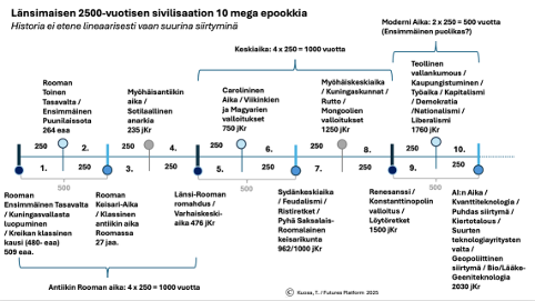 Yksi tapa ajoittaa länsimainen sivilisaatio on sanoa, että sen ensimmäinen alkio syntyi Rooman tasavallan myötä 509 eKr. Jos otamme sen lähtökohdaksi ja ulotamme näkymän nykyhetkeen, saamme noin 2 500 vuoden aikajakson. Jaettuna 250 vuoden yksiköihin se antaa yhteensä noin kymmenen mega-epookkia.