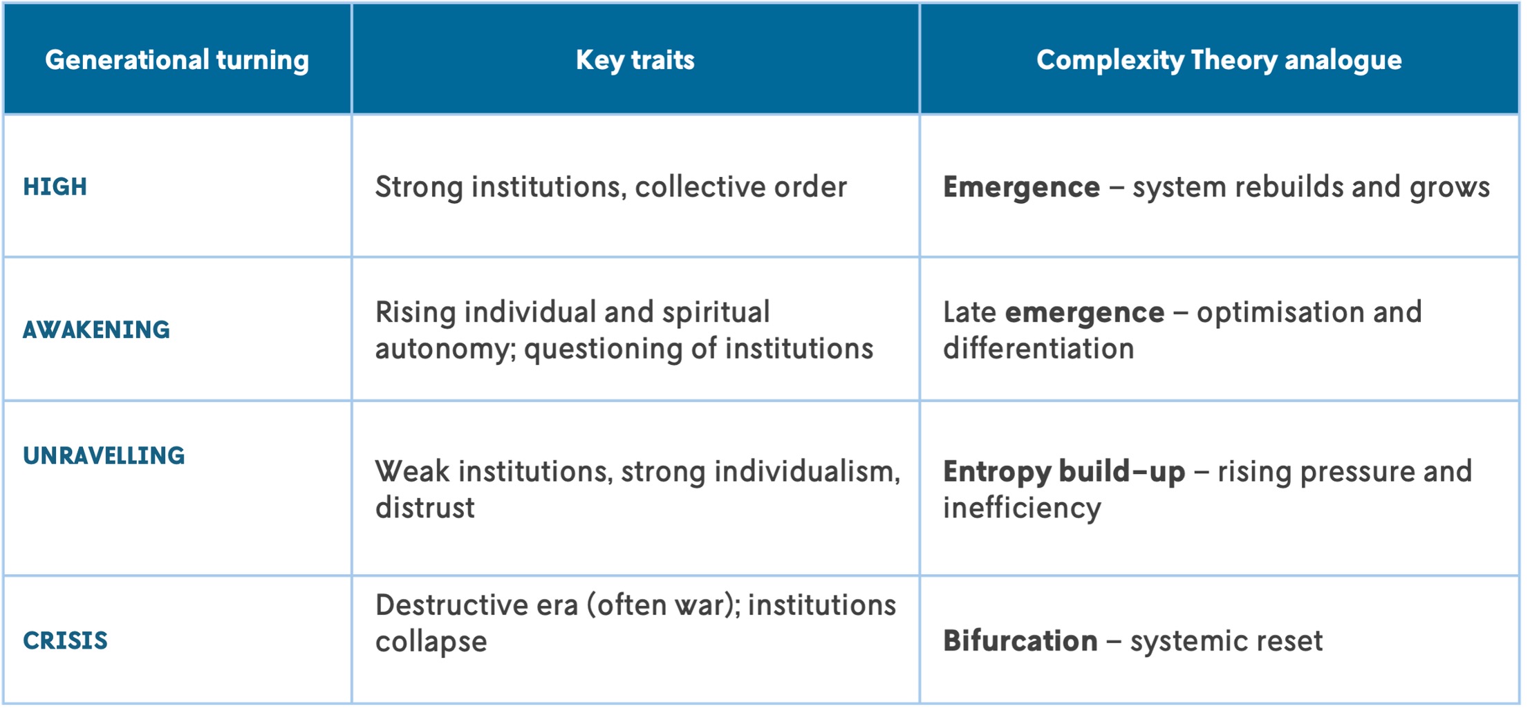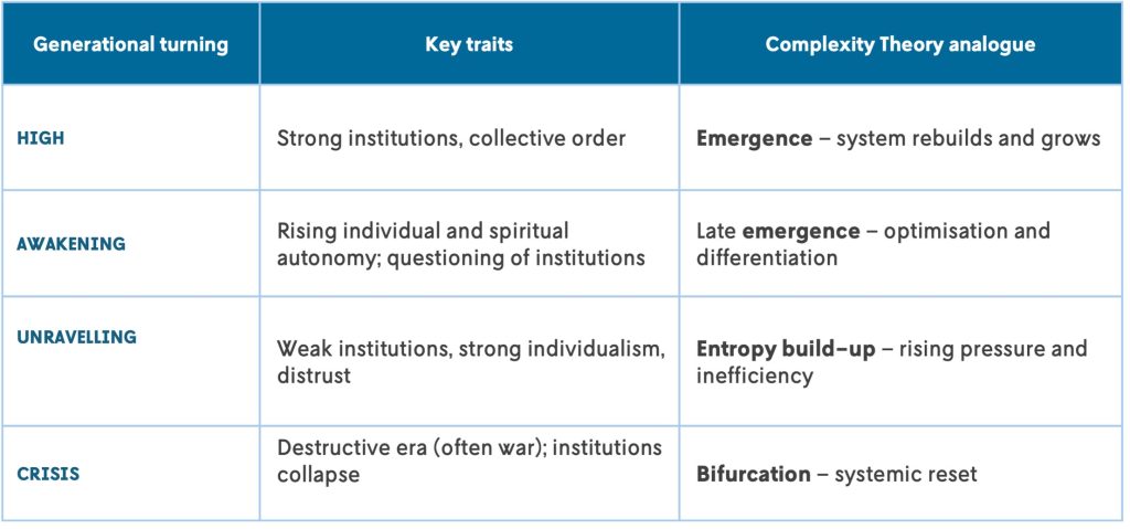 Straussin ja Howen neljä käännettä ovat läheisessä linjassa kompleksisuusteorian kolmen vaiheen kanssa.
